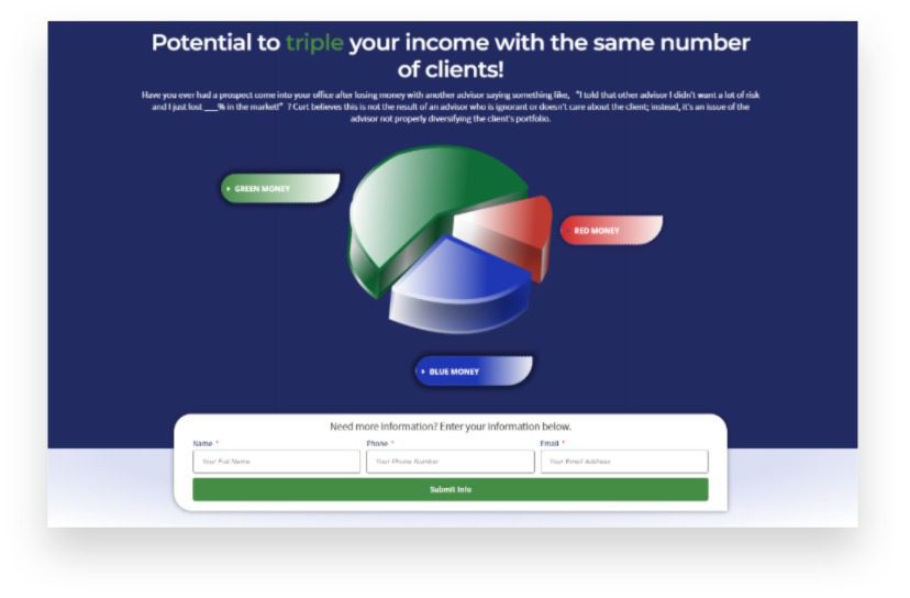 RBG Concepts ® is a user-friendly tool that displays the proper allocation of your client’s assets based on cutting-edge software. The developer, Curt Whipple, increased his sales by 10x per year using this tool.